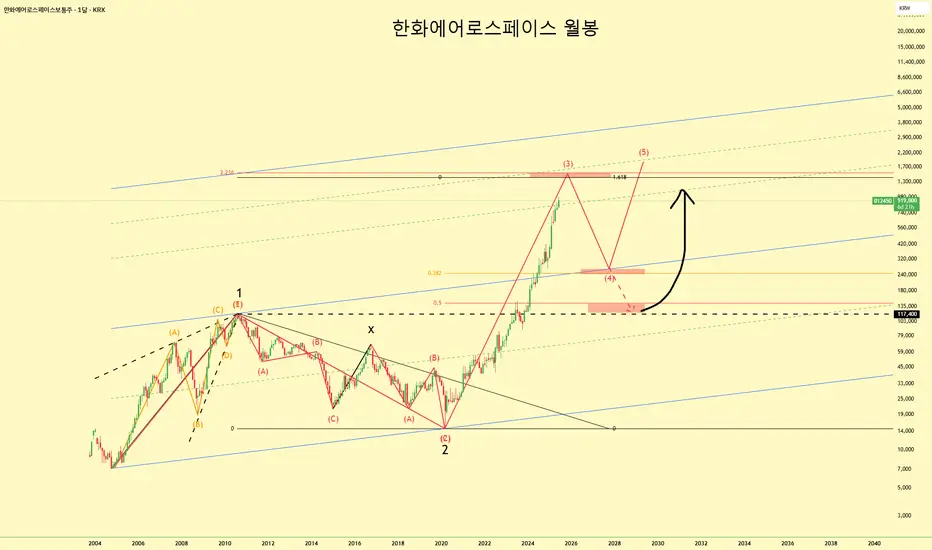 현재 한화에어로스페이스 월봉차트는 엘리엇 파동 이론 관점에서 다음과 같이 카운팅할 수 있습니다.