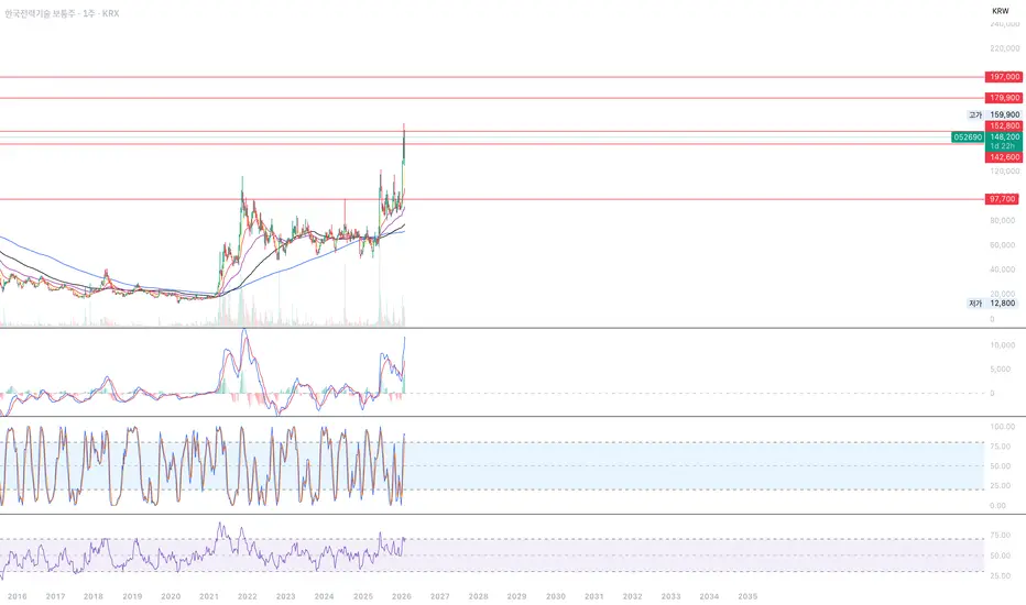 문의하신 한전기술(052690)입니다. 최근 신고점을 갱신 후 지지 테스트가 되었으며 재차 신고점 부근에 위치해 있습니다.
