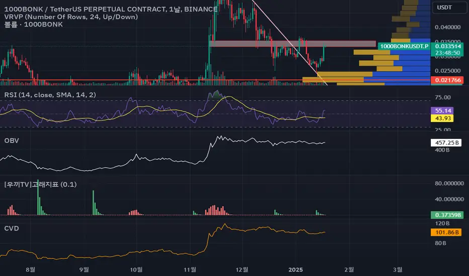 날봉 기준 최근 매물대 SR FLIP역할을 한 구간을 돌파하면, 분홍색 하락추세도 돌파했고 날봉
