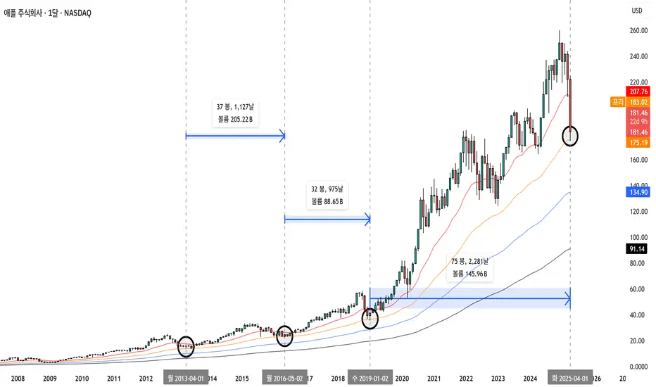 애플의 월봉 50이평선을 보시면 역사적으로 3번 닿였었는데요.
