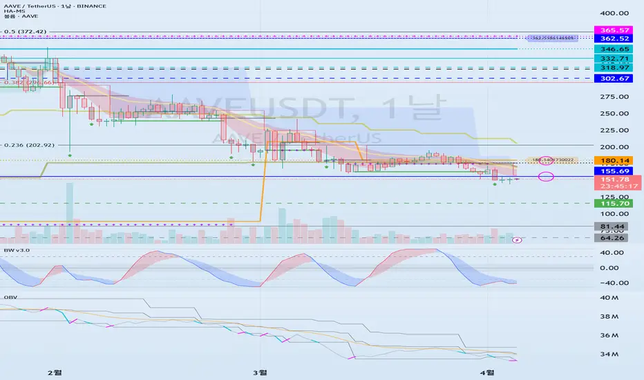 OBV지표가 저점선을 갱신하고 있기 때문에 이번에 155.69 이상 상승할 수 있는지가 관건입니다.