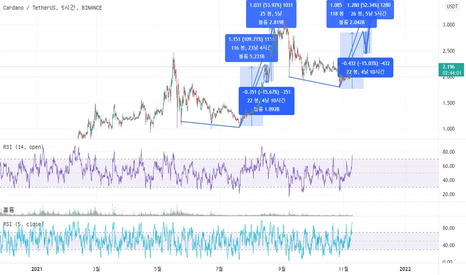 2.863$ 근처에서 5시간봉 기준 rsi 큰 봉 두개 나오면 전량 익절임