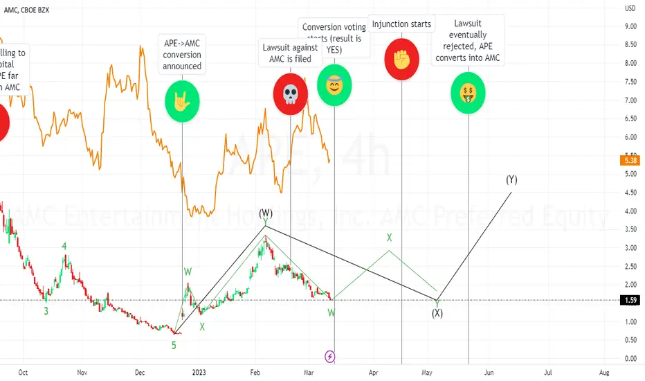 Hello friends. This chart shows the important events with the AMC Preferred Equity, which has been a very fun thing to trade due to the fact that one APE is worth exactly one AMC in THEORY, but in practice, due to the fundamental fact that markets often are wildly inefficient and extremely stupid & delusional, the prices are dramatically different. This presents an opportunity for traders who understand what is going on, and a risk for apes still holding AMC and waiting for a "MOASS" who do not have enough brain cells to comprehend any of it. We made a lot of money from APE by trading it, and we would like to thank the apes for the money.