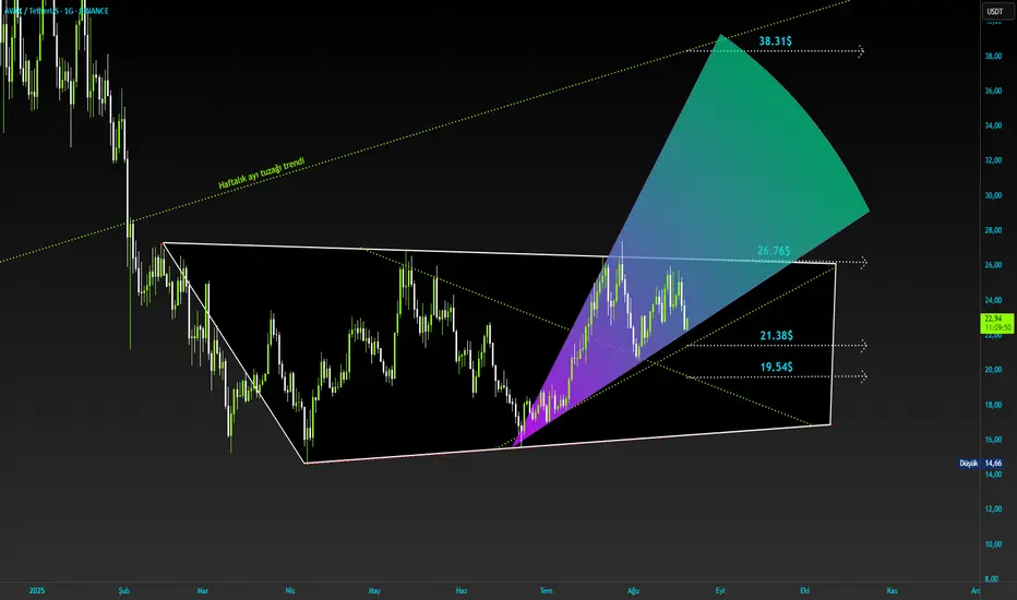 Simetrik üçgeni aldık. Büyük kılırım yeri $26.76 seviyesi. Buradan sonra yüzde 45 önü açık ve hedefi $38.31