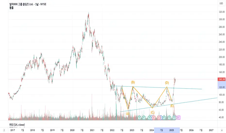 예전에 제가 알리바바 관점을 한번 올린 적이 있었습니다. 그때는 단기적으로 하락을 바라보았습니다. 하지만 그 후로 알리바바는 큰 상승을 한번 주었고, 그때 제가 잘못 분석했다는 사실을 깨달았습니다. abcde 조정파동이 나온 것은 맞으나, 제가 그 파동 카운팅을 잘못했었습니다.