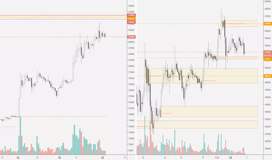1. 4시간봉 기준으로는 515,000원 ~ 511,500원 사이에 형성된 OB 지지 받고 약 반등중인데 단기 목표 564000 ~ 555500 익절 잡으면 되겠습니다.