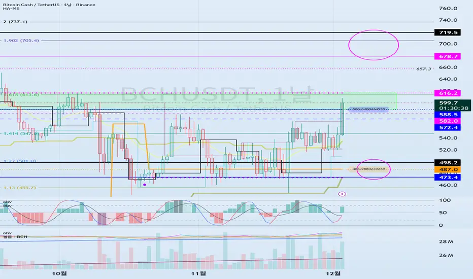 이에 따라서, 588.5-616.2 구간에서 지지 받고 상승할 수 있는지가 관건입니다.