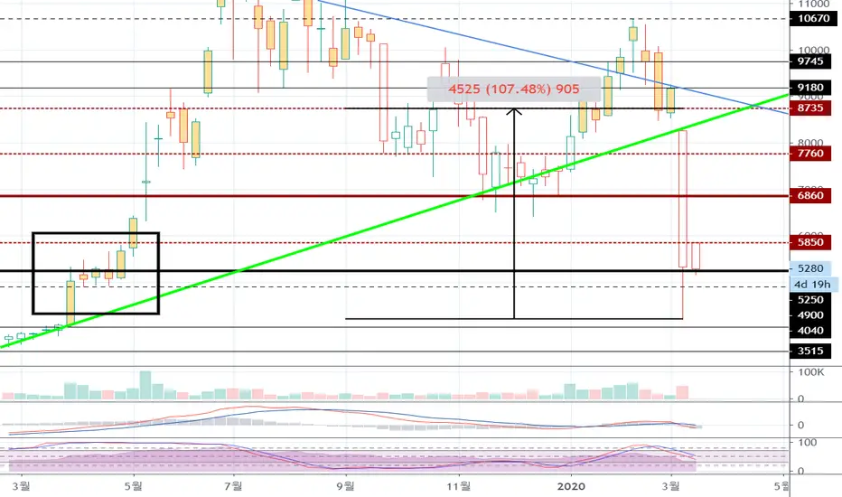 네모 박스가 있는 구간에 보이는 약한 지지 지점인 4900 지점에서 반드시 지지를 받아야 합니다.