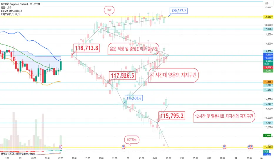 29일 화요일에서는 상승우위 패턴을 가지고 있는 비트코인이지만 상단에 118,712 구간의