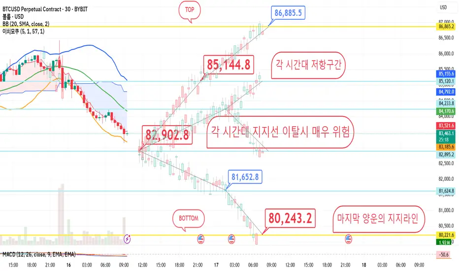 16일 수요일 오전 관점에서는 하단에 지지구간인 82,902 구간의 3시간 4시간 지지선 및