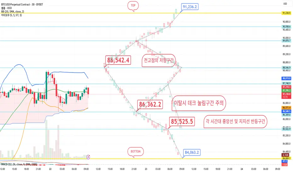 최대 바텀구간인 84,063 자리의 각 시간대 중앙선의 지지구간 및