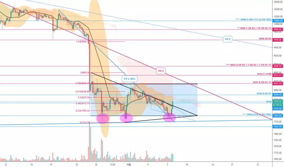 9k 부근에는 추세3이 기다리고 있습니다. 전고점에서 시작된 하락추세선입니다. 저항이 크겠지요.