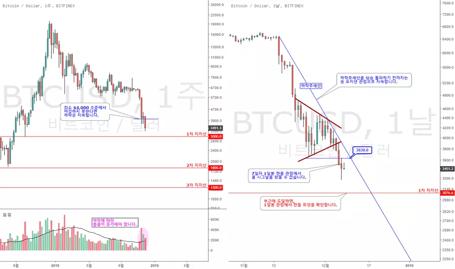 1. 하락추세선을 상승 돌파하며 각각 Bitfinex $3,800 Bitmex $3,630 가격대를 상승 돌파하는지 확인하십시오.
