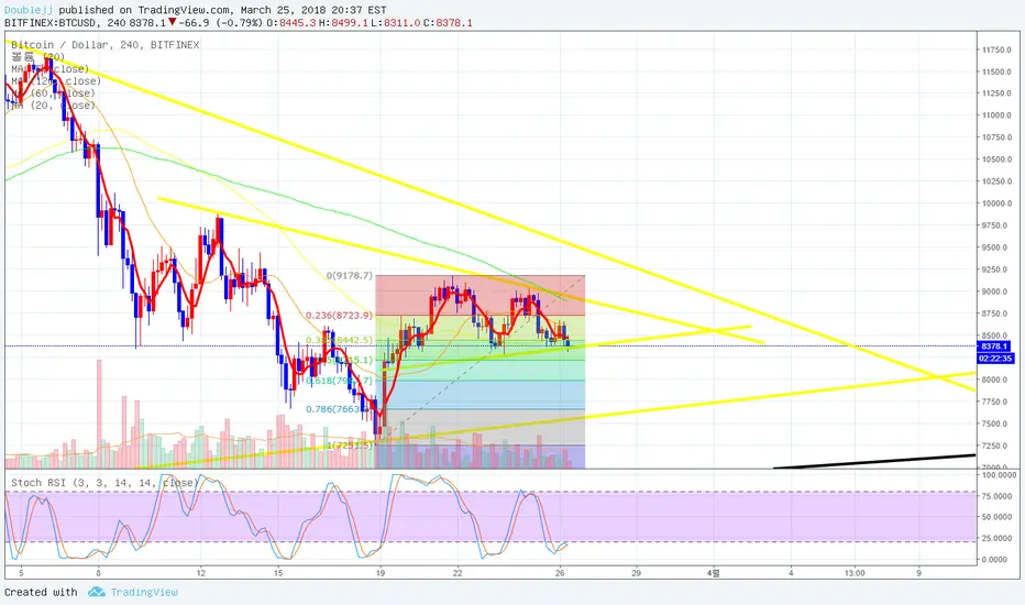 피보나치 현재 0.382 ~ 0.5 구간 눌림 진행 중입니다. 8400 이탈시 수렴의 하방으로 내려가게 되면서 단기 손절가를 생각하신다면,