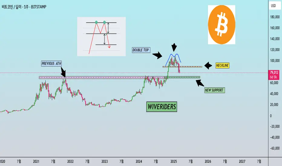 $BTC는 더블 톱 패턴을 형성한 후 넥라인을 하락 이탈했으며, 현재 예상 목표 가격이 **초록색 지지 구간(이전 ATH 수준)**과 일치합니다.