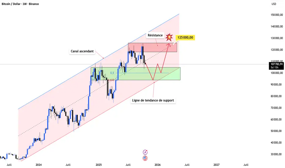 Le prix approche actuellement d'une zone de support importante, marquée par la limite inférieure du canal et une précédente zone de demande. Si cette zone tient, cela pourrait offrir une opportunité pour les acheteurs de revenir avec force. L'objectif de hausse attendu est de 125 000 $, ce qui coïncide avec le milieu du canal et le niveau de résistance précédent.