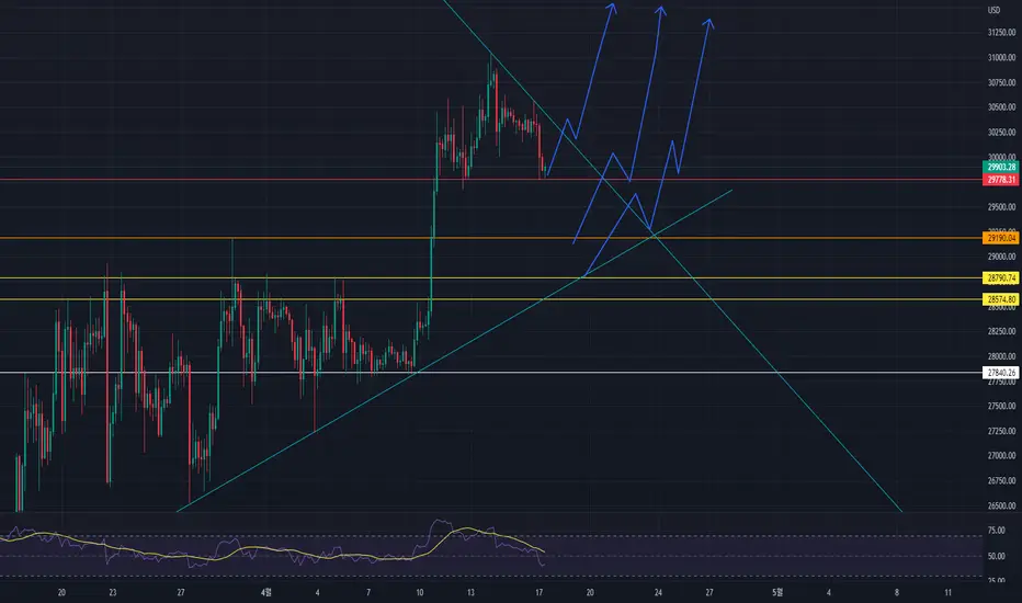 반등이 가능하지만 하늘색 추세를 상방 돌파 하지 못하고 29.2k마저 이탈할 경우