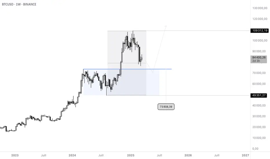 Il y a de fortes probabilités que BTC ait fait son bottom avant une nouvelle hausse. Personnellement, je l’attendais un peu plus bas, précisément à 73 808$, pour venir retester le bloc institutionnel à l’origine du dernier mouvement haussier.