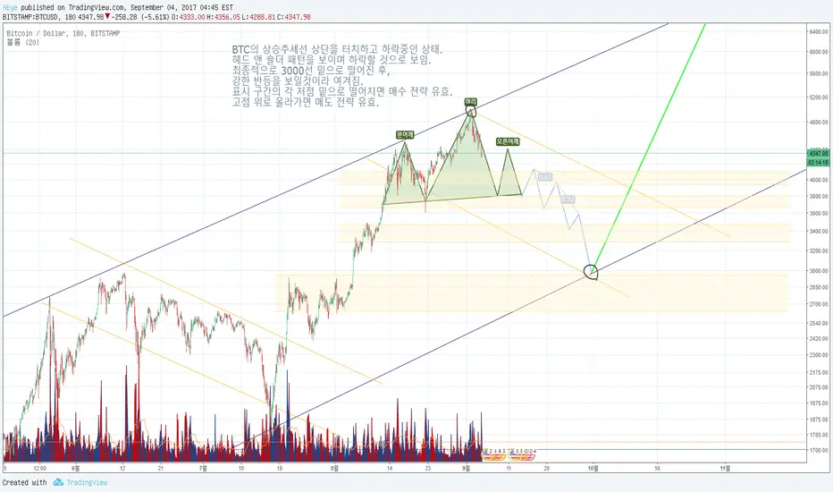 헤드엔숄더 패턴 후, 하락 진행중.2600~3000 사이의 매물대 구간에 도착하는 시기에 따라 반등 시점이 다를 것으로 보이고