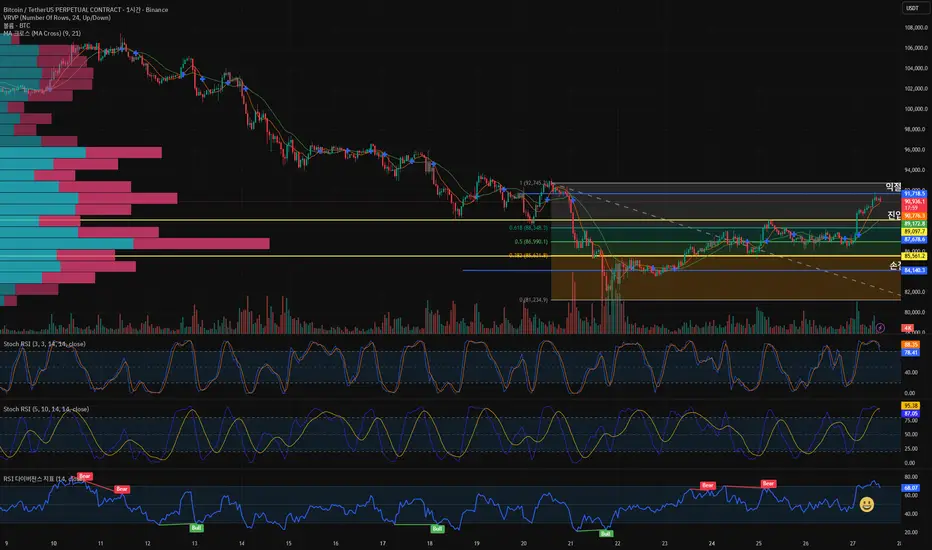 최근 이평선 수렴 구간을 벗어나며 정배열 확장이 나타났고, RSI와 스토캐스틱 RSI도 과매도 구간에서 강하게 반등하며 과매수 영역으로 재진입했습니다.