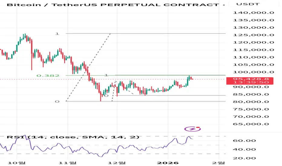 고점 안 뚫고 90k까지 떨어질 수 있다고 봅니다. 피보 두개 겹치고 rsi 높고 엘파관점으로 바닥부터 플랫 abc 나왔다고 보여집니다.