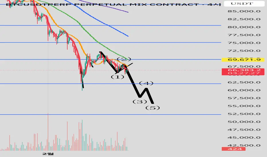 따라서 하락 5파동 진행으로보며 , 이는 56000불 <주봉240선> 혹은 과한 하락으로 급격히 떨어질경우 53000불<피보나치 1:1>에서 강한반등으로 시장을 조성할 가능성이있다.