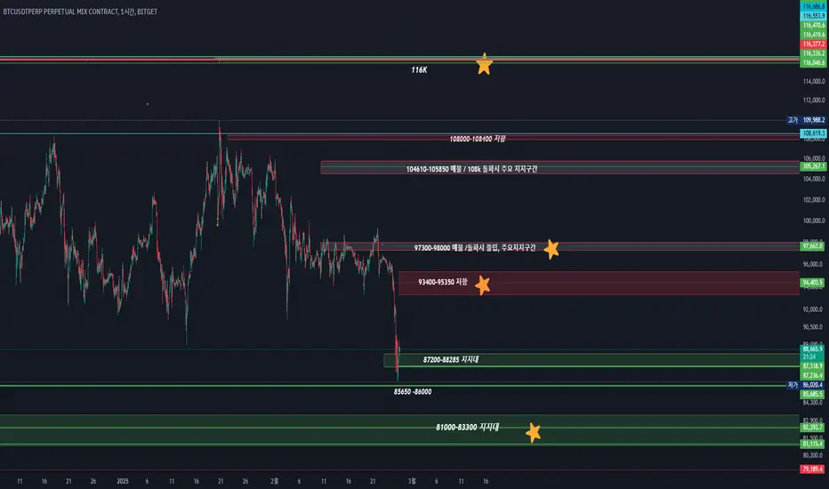 현재의 86000 직전저점부근부터 혹은 깨지더라도 85650부근이후부터이어지는 상승시그널이 나오면서 소파동 마무리가된다면 재차 반등/상승 가능한 공통롱구간으로 롱존으로 보고있고 직전저점이 깨지면서 이어지는 시그널의 위치의 마지노 지지로 81000-83300 지지대를 생각중