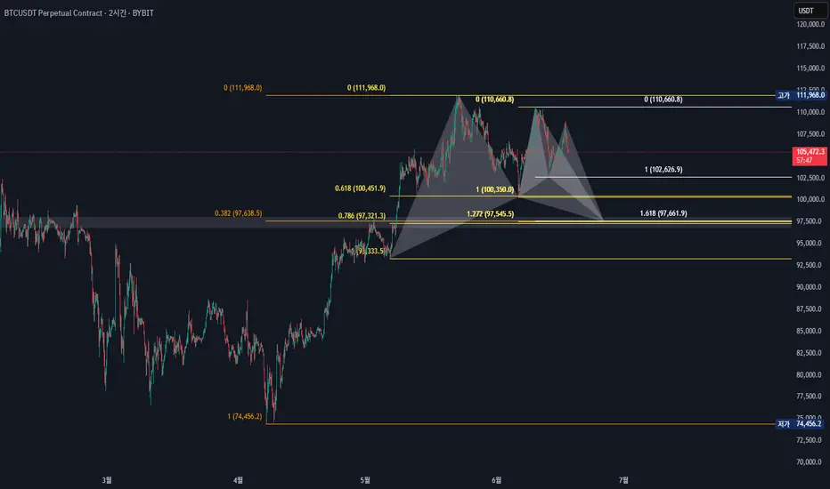 두 하모닉 패턴의 PRZ가 중첩되는 구간으로, 반등 가능성이 있는 기술적 지지 영역입니다.