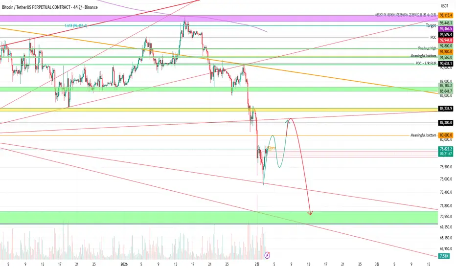 저점갱신을 계속 하고 있는 시점에서 74K 마지노선까지 이탈하게되면 69K - 52K 까지도 하락 할 수있는것을 염두에 두어야 합니다