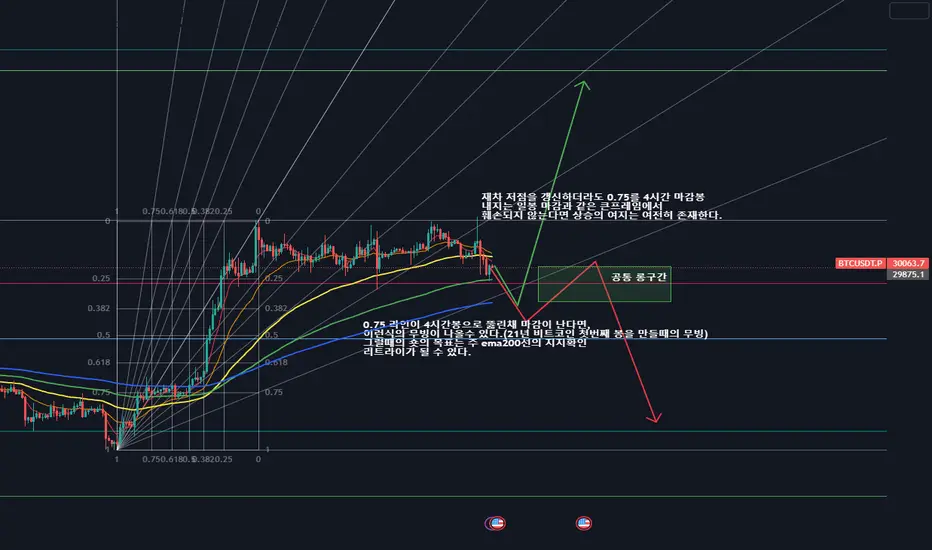 이제 지난 고각의 양봉의 유동성 ( 추격으로 들어갔던 롱 포지션들을 종료시키는)은 모두 제거되었다고 판단이 됩니다. 이제 이곳에서는 숏의 입장에서도 또다시 선택지가 나뉘어집니다.