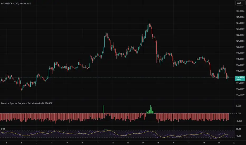 이 지표는 바이낸스 무기한 선물(Perpetual Futures) 과 현물(Spot) 시장에 상장된 코인들의 가격 프리미엄(%) 을 실시간으로 계산하고, 이를 컬럼 차트(막대 그래프) 형태로 시각화합니다.