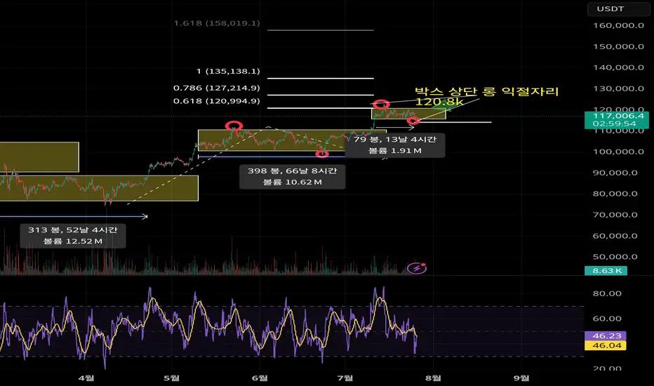 박스 상단의 추세기반 피보나치 비율에 115,7롱 물량은 익절하고 무빙을 관찰 해야겠네요