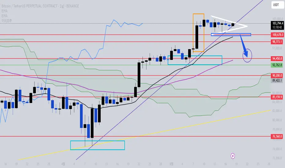수렴구간에서 이탈이 된다면 일봉 기준의 상승추세선도 이탈이 되는 것이기에 높은 확률로 100678 구간까지 리테스트가 나올 가능성이 높습니다.