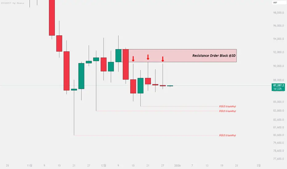 - 3일봉 차트에서 저항 오더블럭이 발생한 곳을 세 차례 두들겼지만, 결국 뚫지 못한 상황입니다.