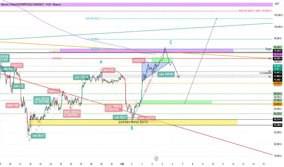 깃발형 패턴은 강한 상승을 위한 패턴이긴 하지만, 윗꼬리로 달리면서 추세의 C파 마무리자리 96.2K 까지 상승이 나올겁니다