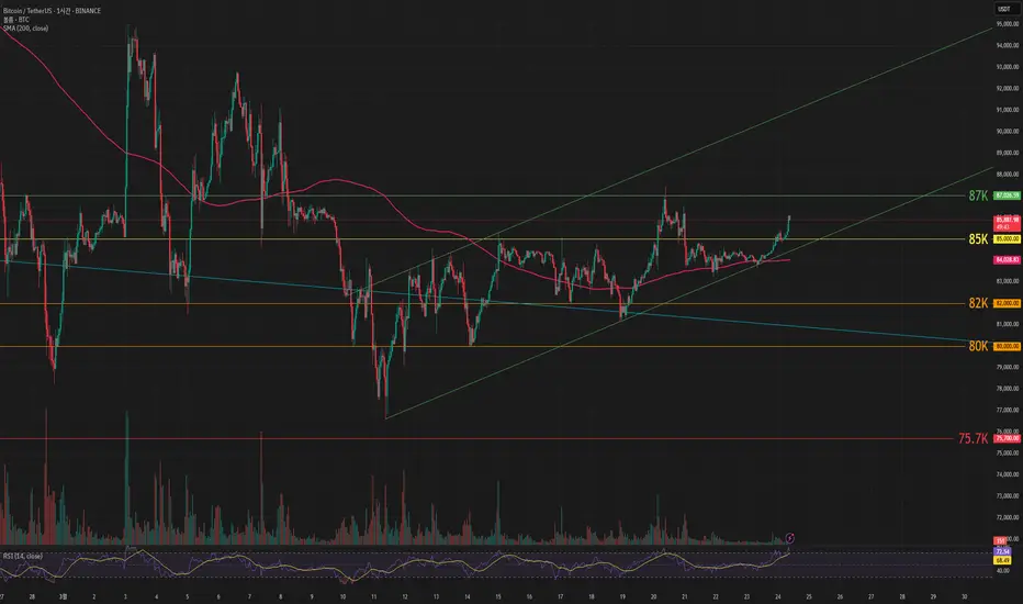 비트코인 가격은 주말간 200 이평선 따라 횡보하다가 상승하면서 86k 까지 올라간 상태입니다. 이대로 87k 돌파한다면 상승 추세 유지하면서 추가적인 상승을 기대해 볼 수 있을 것으로 보입니다.