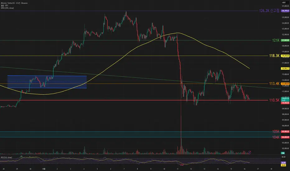 하락 관점으로 110k 아래로 떨어진다면 105~104k 까지 떨어질 수 있어서 주의가 필요해 보입니다.