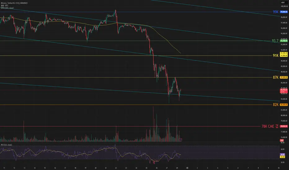 하락 관점으로 87K 저항선 위로 안착하지 못하고 횡보하면서 RSI 과매도 해소 후에 82K 지지선 아래로 떨어지면 78K CME 갭 채우면서 떨어질 수 있어서 주의가 필요해 보입니다.