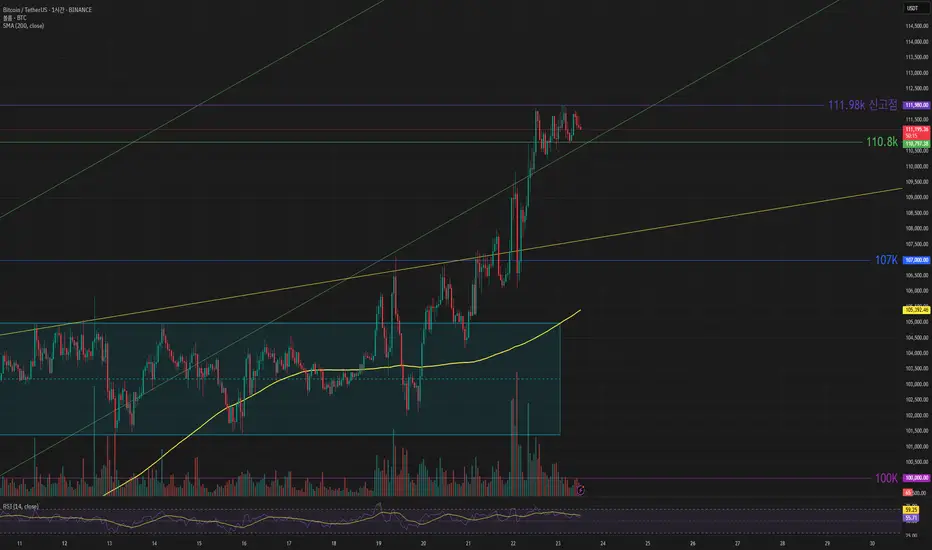 비트코인 가격은 상승추세선 위로 안착하며 신고점을 갱신해서 112k 까지 올라갔다가 110.8k 지지받으며 횡보중입니다. 이대로 상승추세선 지지받으며 횡보한다면 추가적인 상승을 기대해 볼 수 있을 것 같습니다.