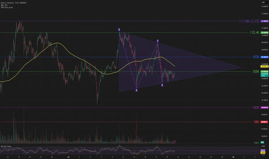 하락 관점으로 104k 와 수렴하단 이탈하며 하락할 경우 103k 에서 지지받을 것으로 보입니다. 추가하락이 발생하면 100k 까지 열어놓고 대응해야 할 것 같습니다.
