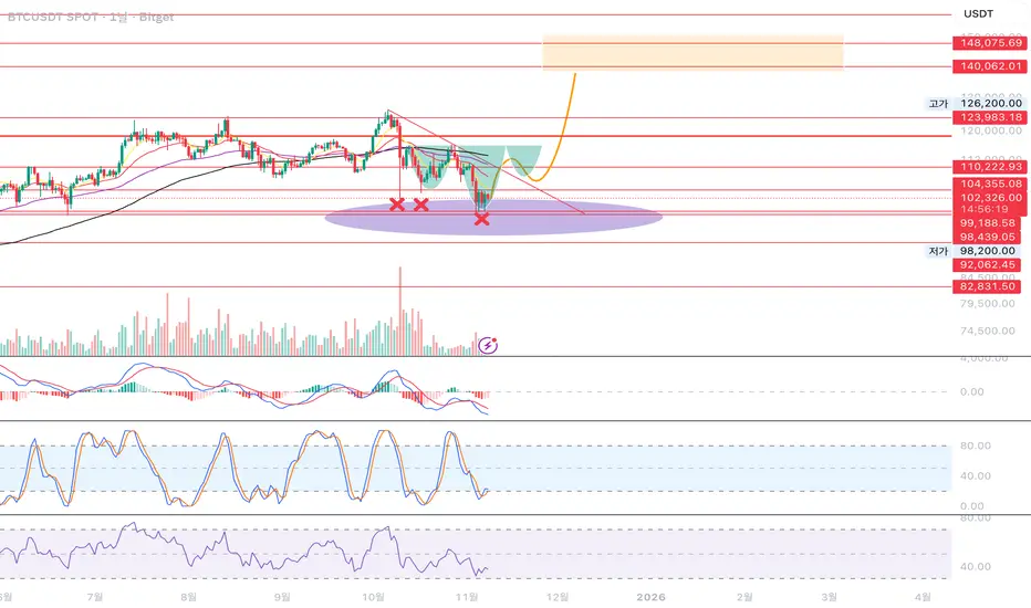 99K는 주봉 기준 주요 지지 구간으로 99.5K에 2차 진입 구간을 변경하고 비중 추가를 진행하였습니다.