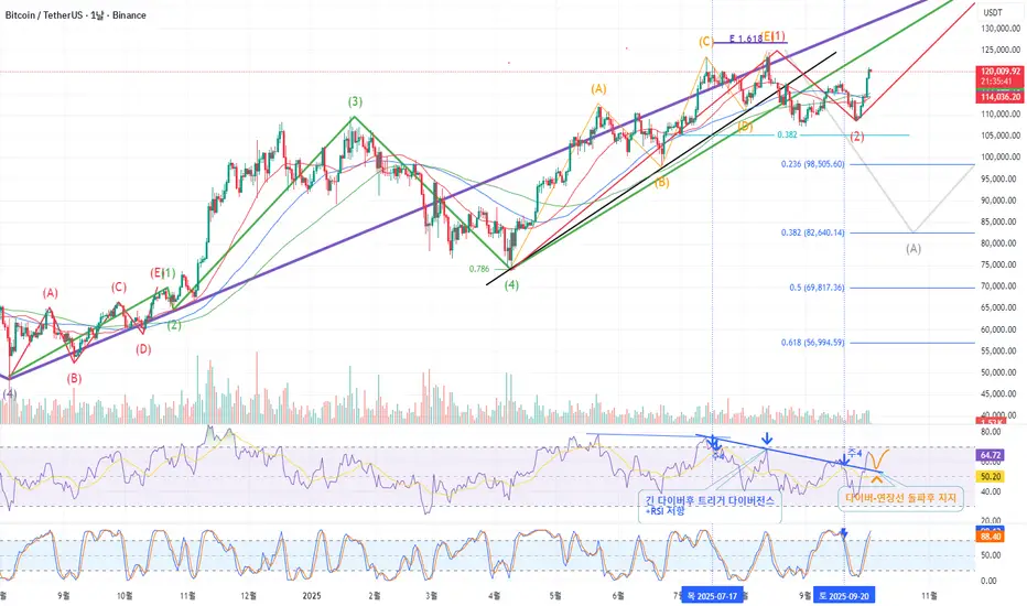 보조지표 RSI 다이버전스 연장선 돌파중으로, 돌파한 연장선(추세선) 지지시 가능성 더 올라감