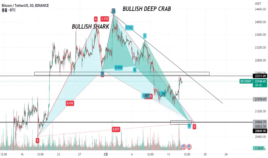 SHARK PRZ + DEEP CRAB PRZ + ABC 1.618 확장비율 + 6시간봉 중/장기 이평지지 + 수평 매물대 등 이있습니다.