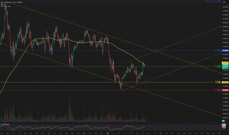 하락 관점으로 115k 돌파하지 못하고 내려온다면 113k 까지 열어 놓고 대응이 필요해 보입니다. 추가하락이 오면 112k 에서 지지 받을 것으로 보고있습니다.