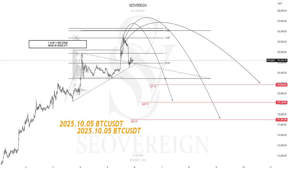 첫 번째는 1.902 CRAB 패턴입니다. 전통적인 크랩 패턴은 XA 구간의 1.618 확장 비율을 주요 PRZ(패턴 완성 구역)으로 보지만, 실전에서는 1.902XA와 같은 추가 확장값이 형성되는 경우가 자주 관찰됩니다. 이 구간은 가격이 과도하게 확장된 뒤 급격히 반전할 가능성이 높은 영역으로, 하모닉 패턴 중에서도 강한 변동성과 반전 신호가 자주 출현하는 자리입니다. 현재 비트코인은 바로 이 1.902XA 수준에서 저항을 맞이하고 있으며, 이로 인해 단기적인 하락 전환 가능성이 점차 커지고 있다고 판단합니다.