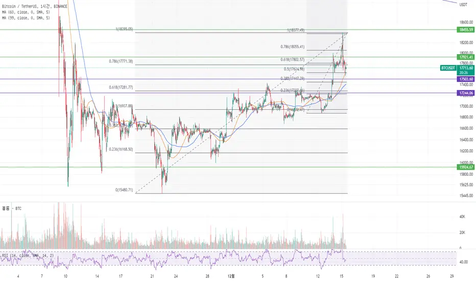 반등이 오더라도 위쪽매물대인 17780,17921 부근에서 눌릴가능성이 크다보며 아래로는 이번파동의 피보나치 0.382부근의 17500가 있는데 깨질 확률이 높고 이번 상승의 전체 파동의 0.618부근인 17243가 19300까지 볼수있는 한파동의 추가 상승이 있다면 가능한 최대 낙폭입니다 조정의 확정이라면 그밑으로 봐야하는데 깨질시 다시 흐름과 타점 공유드리겠습니다.