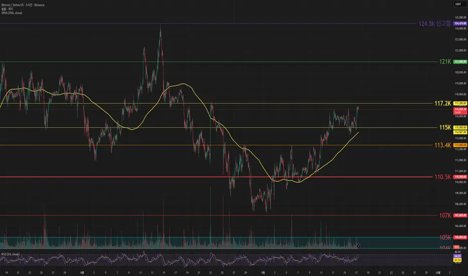 하락 관점으로 117.2k 터치 후 하락하거나 200 이평선과 115k 지지선 아래로 떨어지면 113.4k 까지 열어놓고 대응이 필요해 보입니다. 추가하락이 온다면 112k 까지 떨어질 수 있어 보입니다. 내일로 넘어가는 새벽 금리발표와 FOMC 기자회견이 예정되어 있어 변동성 크게 나타날 것으로 보입니다.