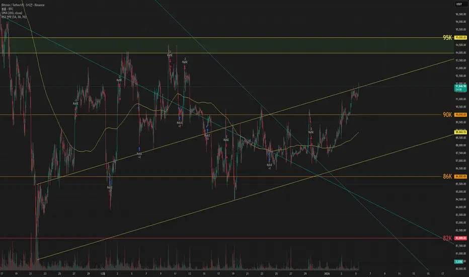 반면 91K 아래로 하락하며 다시 상승 채널 안으로 진입할 경우 89K~90K 구간에서 지지를 받을 것으로 보이며, 추가 하락 시에는 87K까지 내려갈 수 있어 주의가 필요해 보입니다.