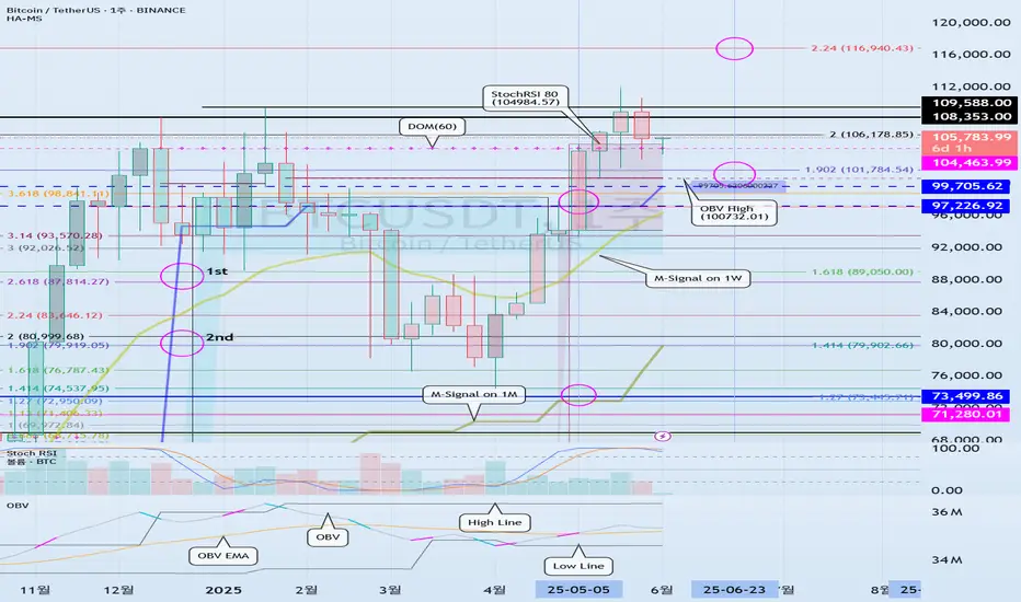 고점을 가리키는 지표로는 DOM(60), StochRSI 80, OBV High, HA-High 지표들입니다.