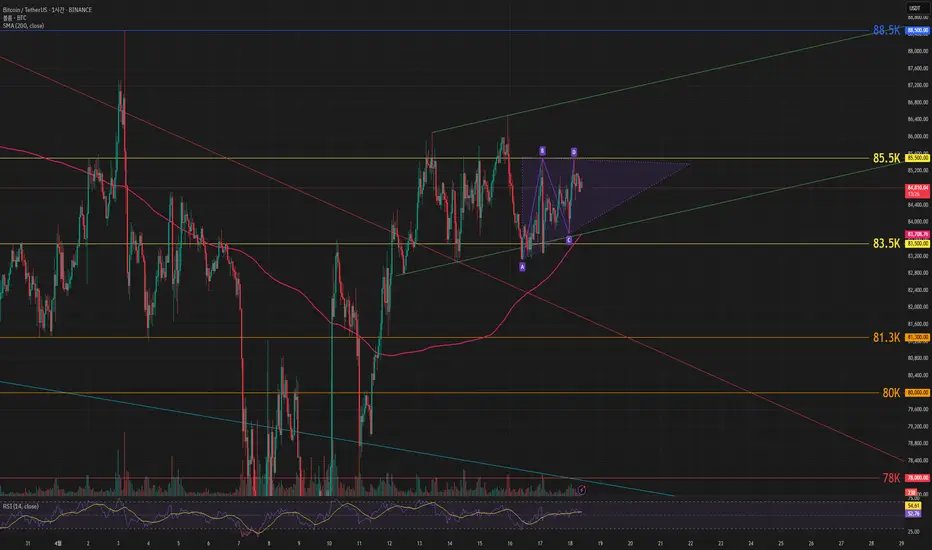 비트코인 가격은 85.5k 저항테스트 하면서 횡보중입니다. 삼각수렴 하단 이탈하지 않고 저항선을 돌파한다면 상승채널 그리며 87k 까지 올라갈 수 있을 것으로 보입니다.